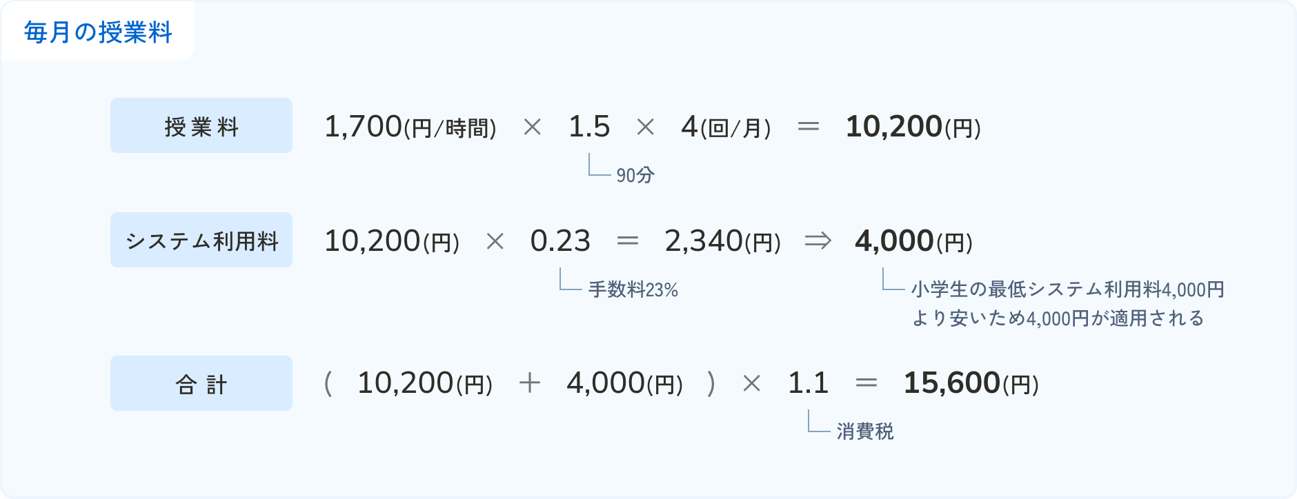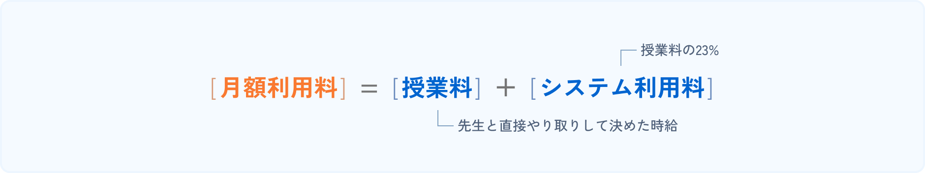 ※[システム利用料]は基本的に[授業料]の23%です。授業料の23%が[月額最低システム利用料]に達しない場合にのみ、[月額最低システム利用料]がシステム利用料として適用されます。